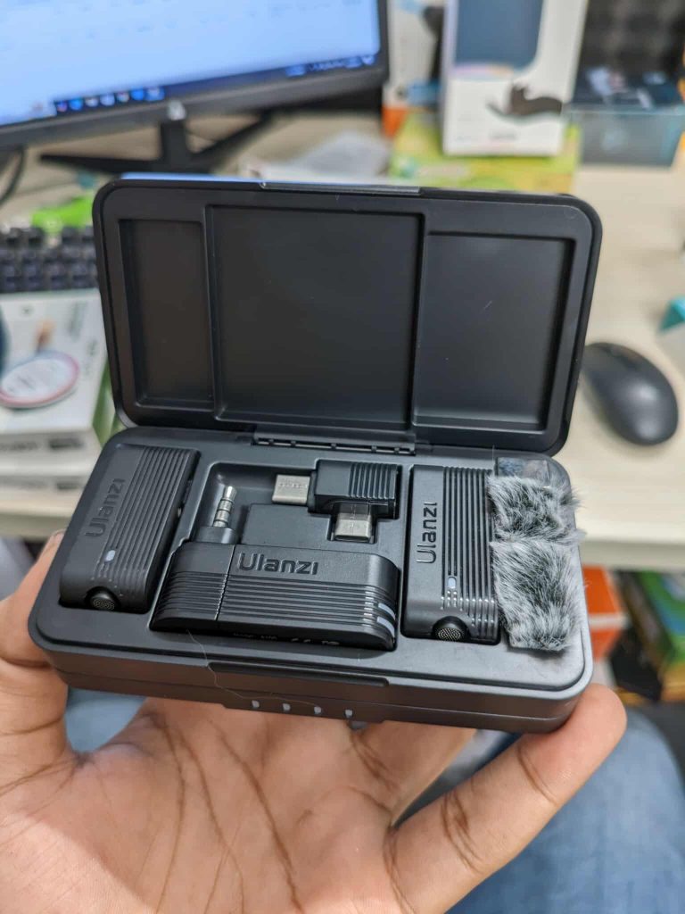 - 2x wireless microphone transmitters, 1x wireless microphone USB-C receiver, 1x USB charging cable, 1x Charging Case, 1x user manual