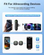- Real Time Audio Monitoring: The phone microphone supports advanced ear monitoring. By plugging in your headphones (supporting Type C), you can hear in real time the audio captured by the lapel microphone wireless, ensuring accurate feedback and enhancing your recording experience.