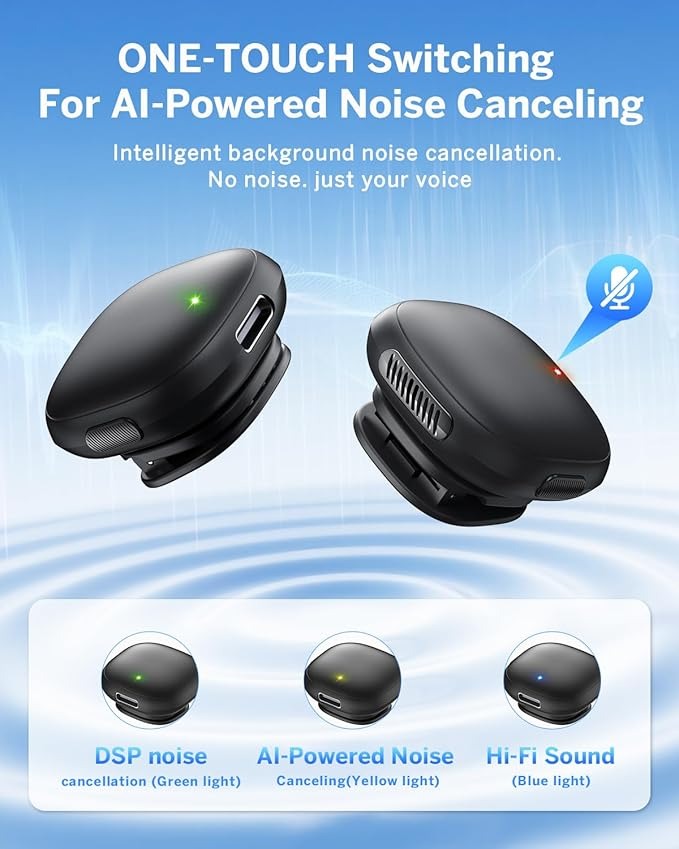 - Upgraded AI Noise Canceling Mini Mic: Adopts 2 different noise reduction modes and 1 Hi-Fi mode.Upon successful pairing, Hi-Fi mode is enabled by default. Single click to switch AI noise cancellation modes. It can eliminate background noise while preserving human vocals. Click again to turn on DSP noise reduction mode, and undistorted human voices, even in noisy environments. It ensures excellent audio signals with minimal background noise. You can also manually double-tap the TX to mute.
